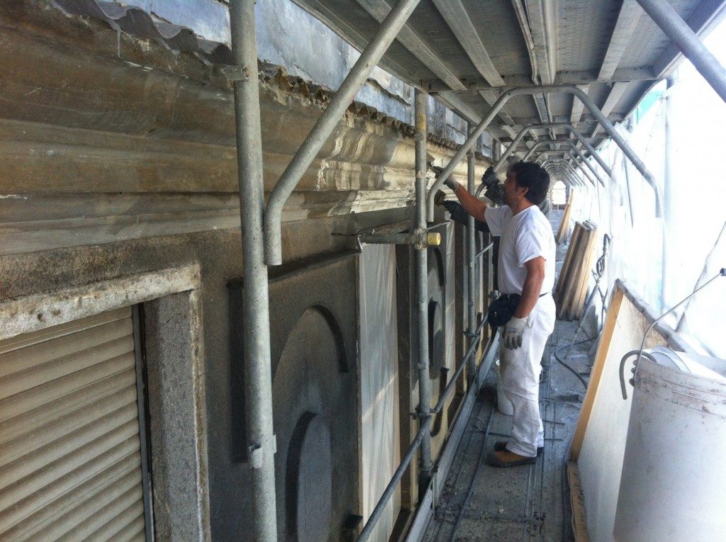 I lavori, stante le notevoli dimensioni del complesso, si sono divisi in 4 lotti. Attualmente è in corso il 3 lotto e si prevede di concludere definitivamente il cantiere a febbraio 2016. I lavori hanno interessato dapprima la bonifica dell’amianto prevedendo la rimozione delle lastre di copertura e la loro sostituzione con nuovi elementi in fibrocemento. Le operazioni di bonifica hanno compreso anche il confinamento delle scossaline marcapiano che sono state trattate con un ciclo di confinamento apposito. Gli interventi sulle facciate sono iniziati con il consolidamento delle parti in fase di distacco nonché la rimozione delle parti decoese e non mantenibili. Quindi si è proseguito con la pulitura tramite Ibix. Per quanto riguarda le lacune degli intonaci colorati “in pasta” si sono individuate delle campionature eseguite con miscele di legante e inerte simili agli originali, procedendo poi con equilibratura cromatica ai silicati per rendere omogenee le superfici. Tutti i prospetti sono infine stati trattati con protettivo silossanico steso a spruzzo, oltre al protettivo antigraffiti sulla parte basamentale del travertino al piano terra.