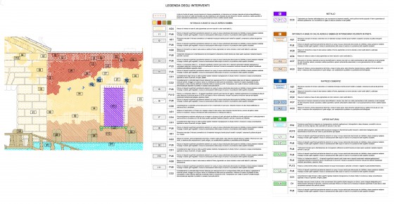 Sono state effettuate stratigrafie diffuse in tutti i vani a piano terra e primo, per comprendere la successione degli strati ancora presenti e, a volte, emergenti dall’ultima pellicola pittorica. I risultati hanno riportato una situazione diversificata, anche se, quasi ovunque, interventi più o meno recenti, hanno comportato la rimozione dei materiali più antichi.