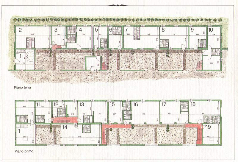 Given the advanced decay that characterized all buildings the only preservable elements were the distribution organization and architectural features, external interventions have been therefore mainly structural consolidation and new realisations. The reinforcement has been performed with concrete foundations along all loadbearing masonry; the interventions on trusses of floors and roof have been generalized because the structures were particularly poor and inadequate and it has been so proceeded with additions and replacements. Interior and exterior plasters have been renewed with lime mortar, the frames of doors and windows with new wood to minimize the impact of renewal and all flooring finishes.